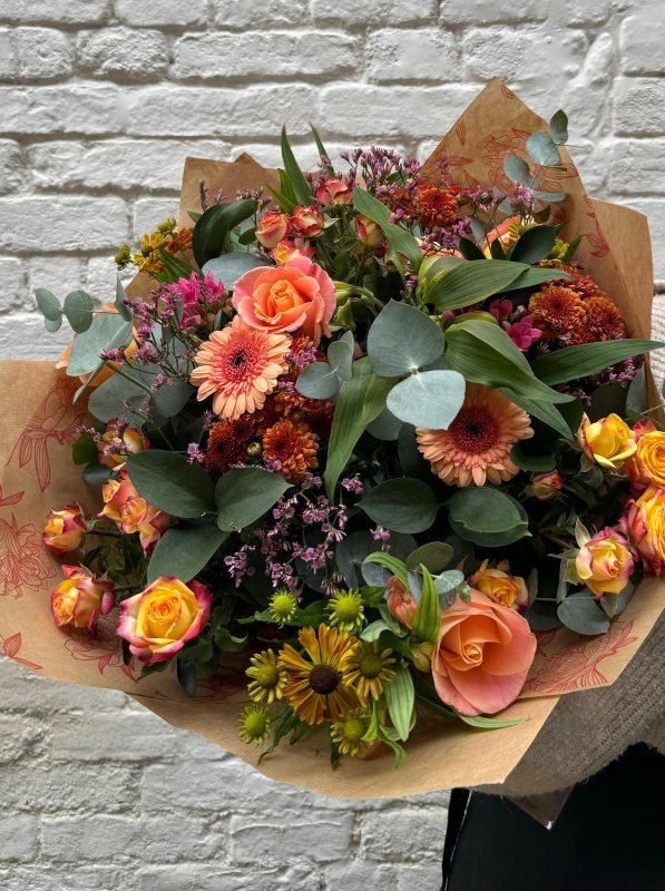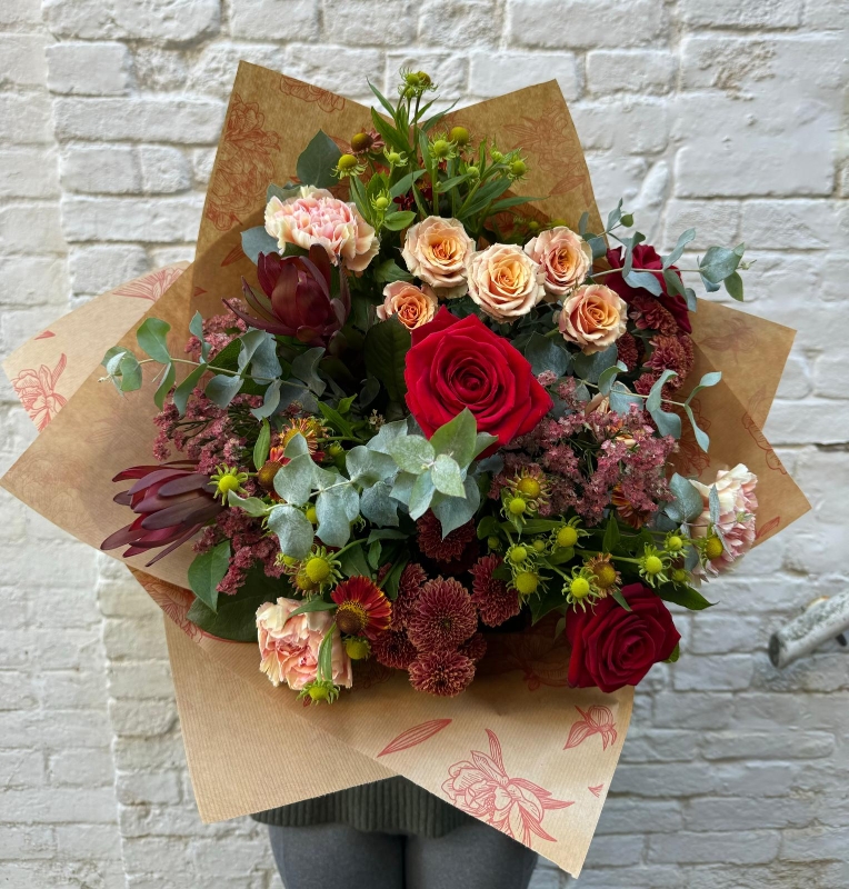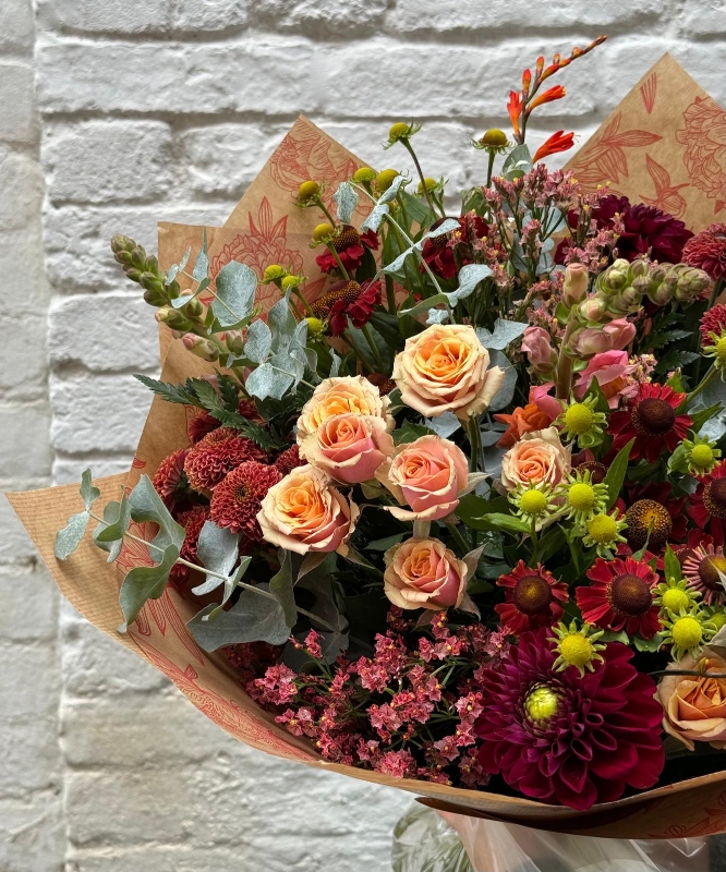 Our Autumnal Arne hand tied is bursting full of Autumnal shades. Featuring predominately red, burgundy and orange, with a touch of yellow or peach hues. This bouquet brings the moody and bright colours of autumn together, in a lovely hand tied full of different textures.