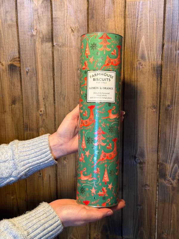Delicious Lemon and Orange Farmhouse Biscuits in a beautiful festive tube.