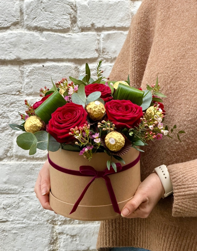 The flowers are arranged in a plant based floral foam, inside a water tight sleeve. When your flowers have finished you can reuse the Kraft box for whatever you fancy. Please call us if you would like an alternative chocolate choice.
